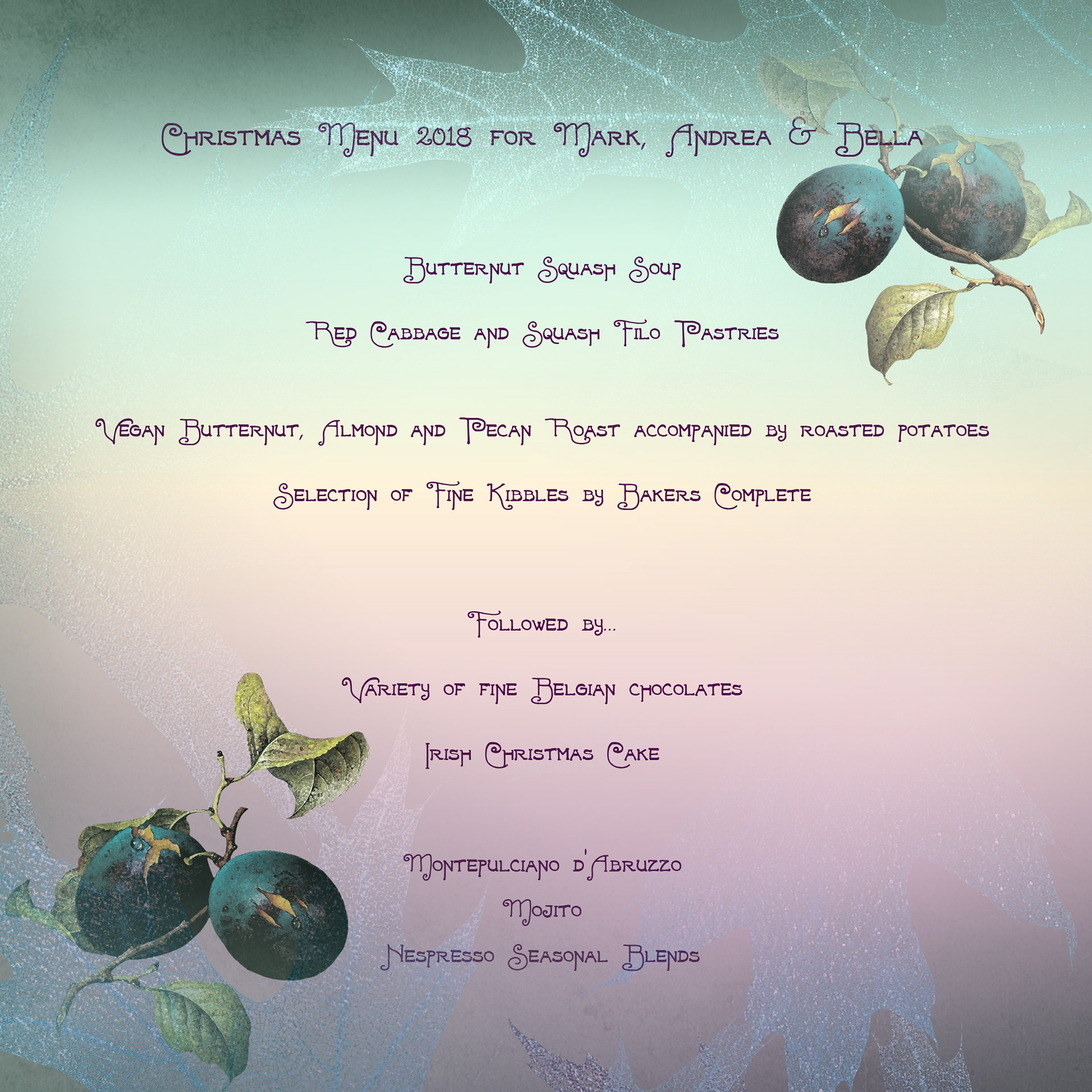 An example of a little Christmas menu for a small family, including a lovely pup.